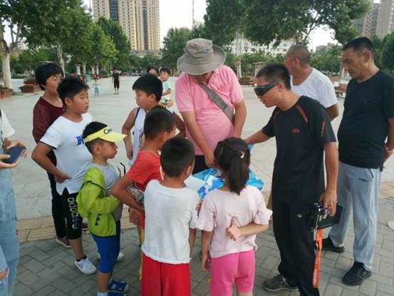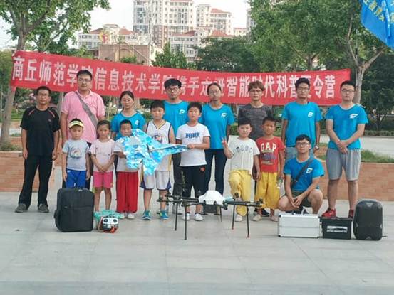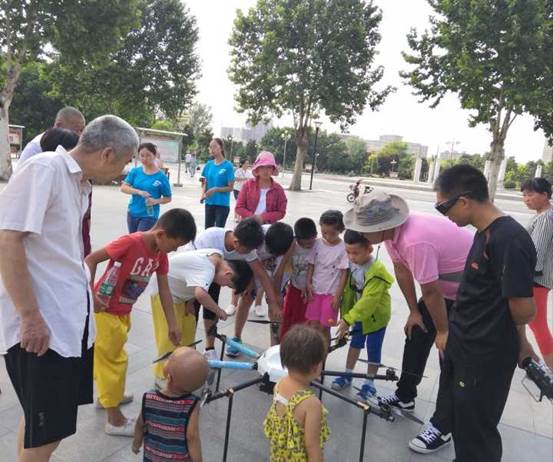之后,指导老师张瑞、柴晓辉到场为孩子们生动有趣地讲解了无人机的构造原理,并且还为孩子们进行实地飞行八旋翼固定翼无人机、四旋翼无人机以及DIY无人机,孩子们惊奇地看向飞起的无人机方向,围绕在老师身旁,迫不及待地问着不同问题。