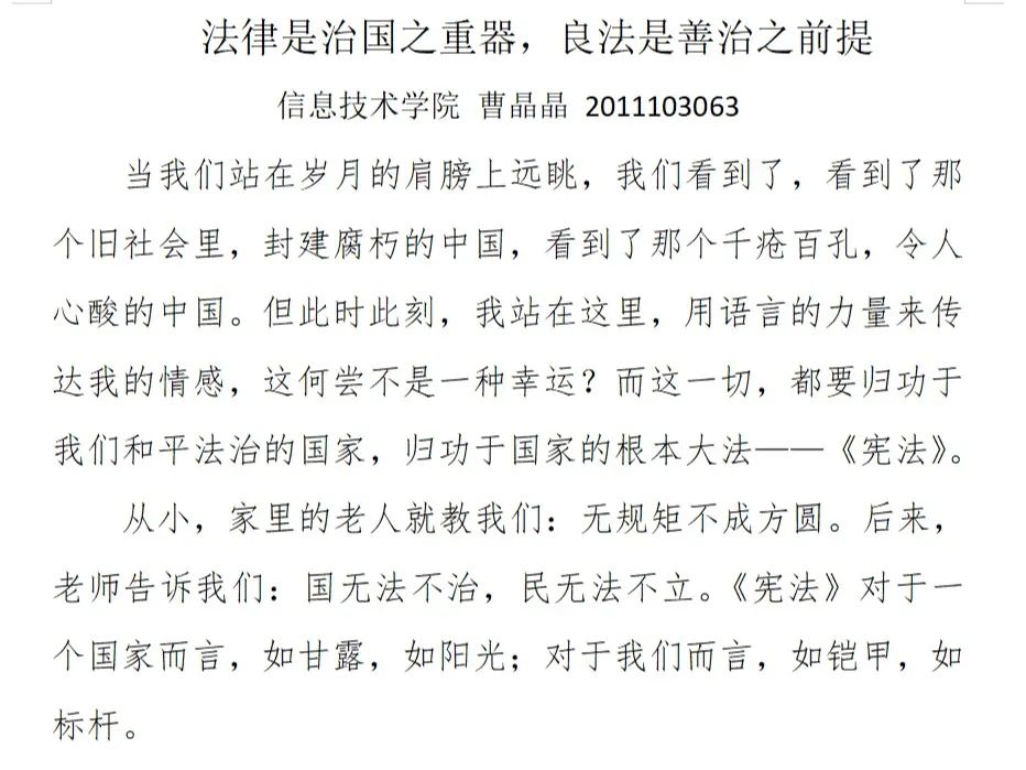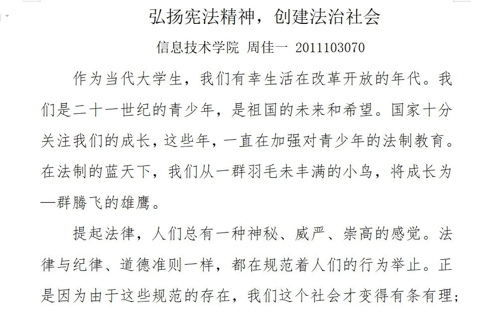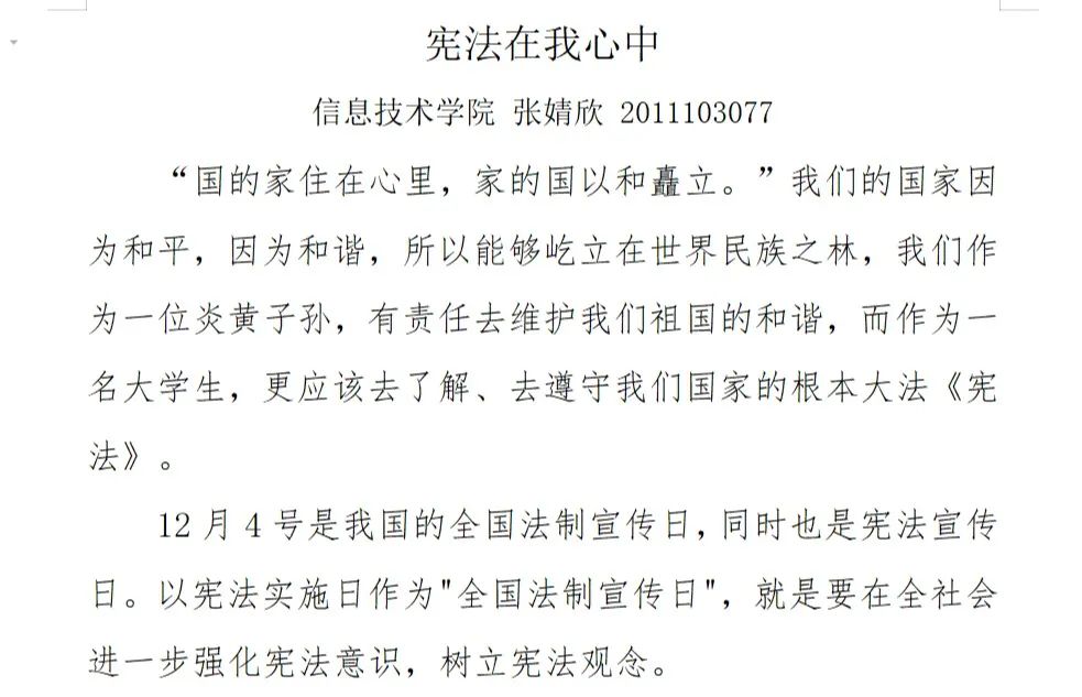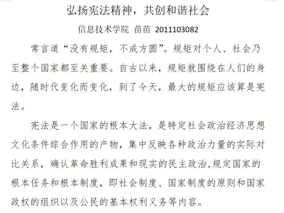 为深入贯彻落实习近平总书记关于宪法学习宣传教育的重要指示精神,推动宪法教育进校园、进课堂、进头脑。11月12日至17日,九九热精品视频开展宪法征文比赛活动,各年级学生积极参与。