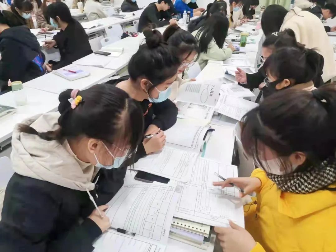 大一新生们在老师的指导下,有序填写记录册。