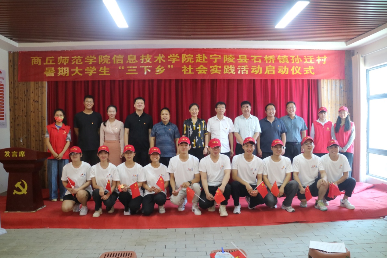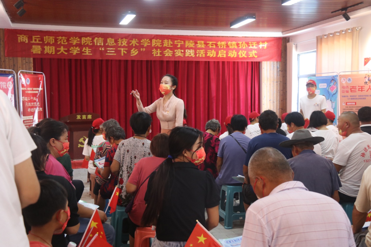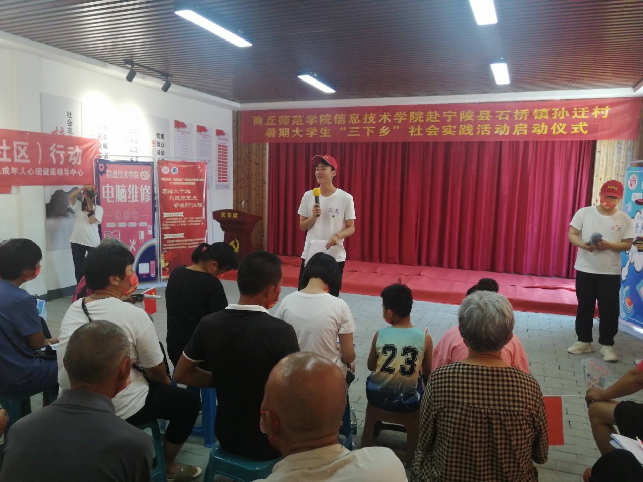 7月21日,九九热精品视频赴宁陵县石桥镇孙迁村开展暑期大学生“三下乡”实践活动。宁陵县委宣传部副部长臧峰,宁陵县团委书记李鹏,石桥镇镇长吕海涛,商丘师范学院团委书记刘培培,副书记徐航,九九热精品视频党委书记王国华,副书记袁慧及十余名学生志愿者参加了此次活动。启动仪式由王国华主持。