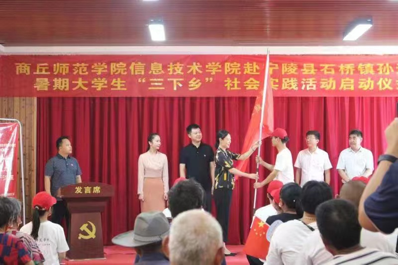 宁陵县委宣传部副部长臧峰对本次活动致辞,他强调,大学生暑期“三下乡”社会实践活动是青年大学生实践成才的“大课堂”,同学们要充分把握此次实践机会,将自己所学的专业知识和先进思想带到乡村基层,开展有针对性的实践内容,创建特色实践活动。商丘师范学院团委书记刘培培为大学生志愿者代表授旗。学生志愿者代表程宣霖做了表态发言。