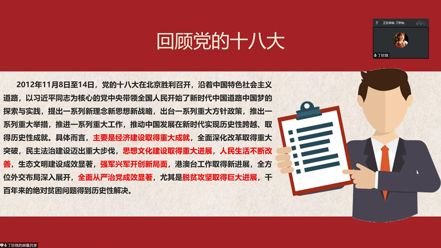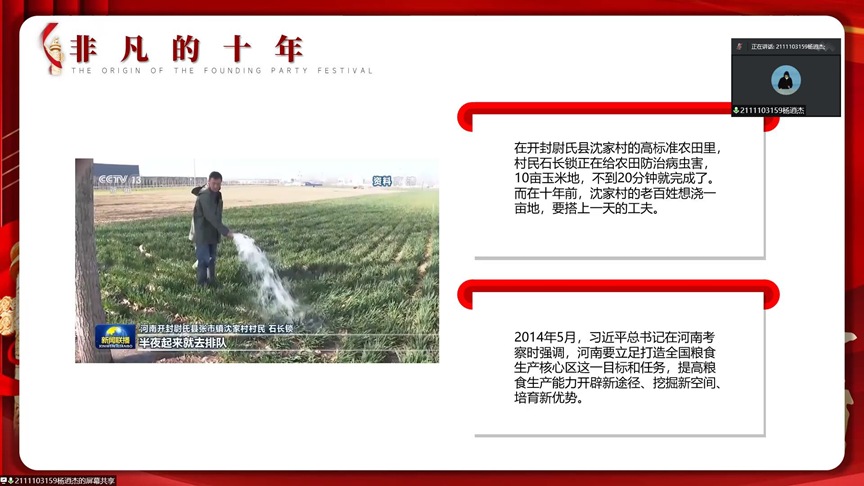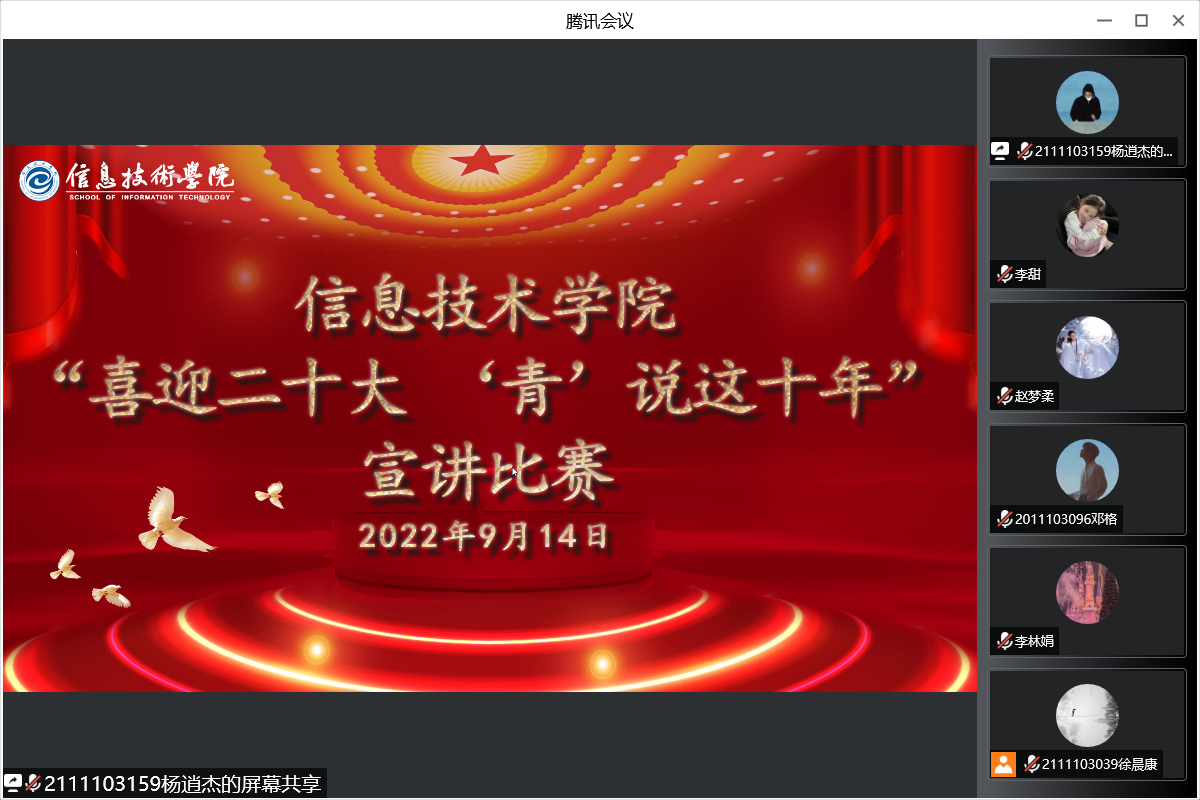 为深入学习贯彻习近平新时代中国特色社会主义思想,号召广大青年广泛学习宣传党的十八大以来取得的恢弘成就、发生的历史性变革,引领青年大学生坚定不移跟党走,矢志建功新时代。9月14日九九热精品视频线上举办了“喜迎二十大,‘青’说这十年”主题宣讲比赛。本次宣讲比赛由九九热精品视频团委学生会文艺部承办,文艺部部长徐晨康主持,团委负责人彭会锋老师和学生会各部门成员共同参与。