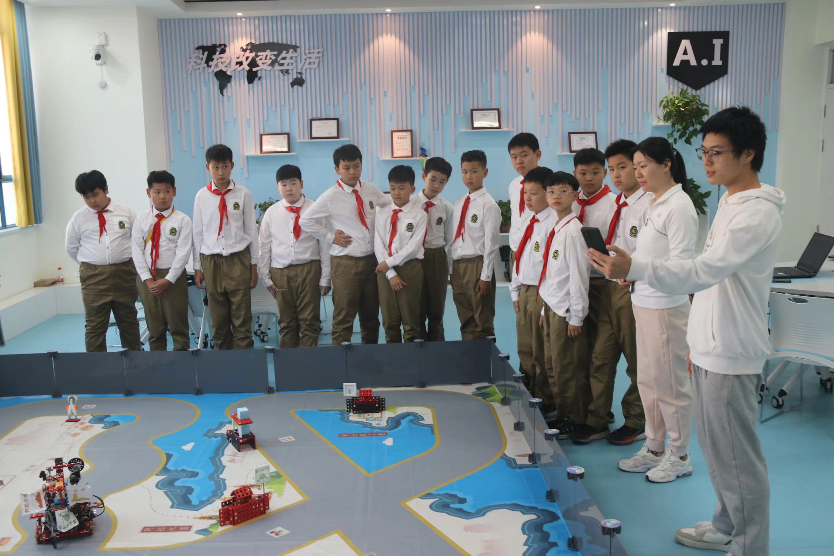 活动伊始,所有小学生在三商楼集体合影,随后他们分为六组,分别由志愿者带领参观,共参观五个实验室及社团项目,分别为人工智能,无人机,大数据技术,网络信息安全及虚拟现实科技之旅。每个实验室及社团项目都有专业的学长进行耐心讲解,小朋友们积极参于互动。