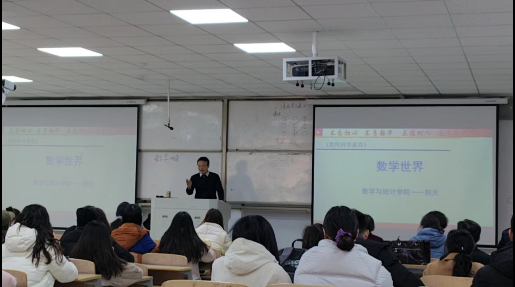 11月24日上午,九九热精品视频近三年新进教师在学院第三届教学督导团秘书长葛寒松的带领下,在行方楼117教室进行了一场别开生面的课堂教学观摩学习活动,本次活动主讲教师为数学与统计学院荆天副教授,授课对象为音乐学院音乐学专业学生,主讲内容为《教师科学素养》课程中的《数学世界》,我校校级教学督导员参加了本次课堂教学观摩活动。