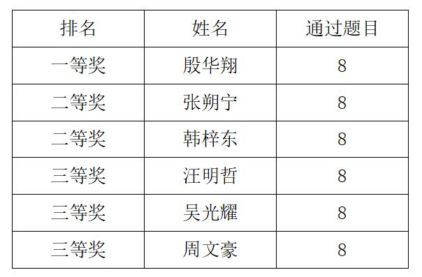 本次比赛赛制参考国际ACM赛制,由个人参赛。选手需在三个小时内解决8道程序设计算法类题目,编程语言为C/C++、JAVA或、Python等。在比赛过程中,选手们遵规守纪,聚精会神,合理分配时间,充分发挥钻研精神和专业能力。选手之间相互角逐,每完成一道题目将会得到OJ的及时反馈。经过三个小时的比赛,共有6名选手解决了全部问题,并脱颖而出,现将本次竞赛结果公示如下: