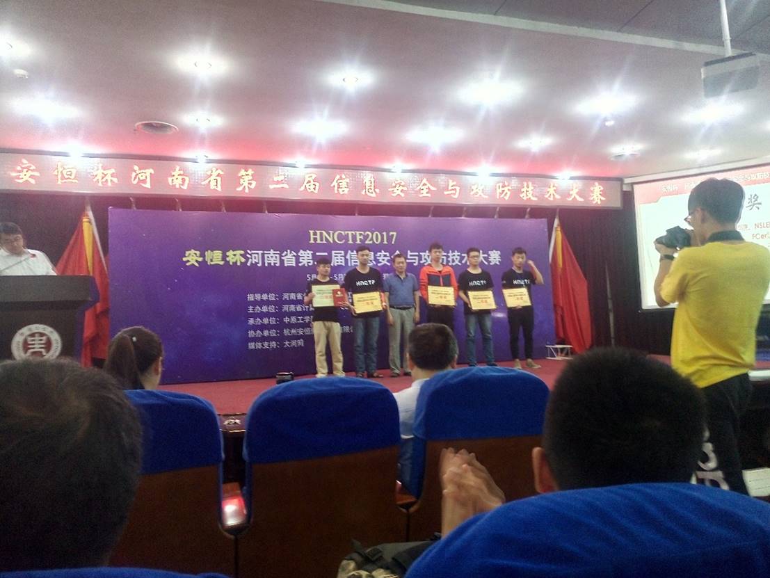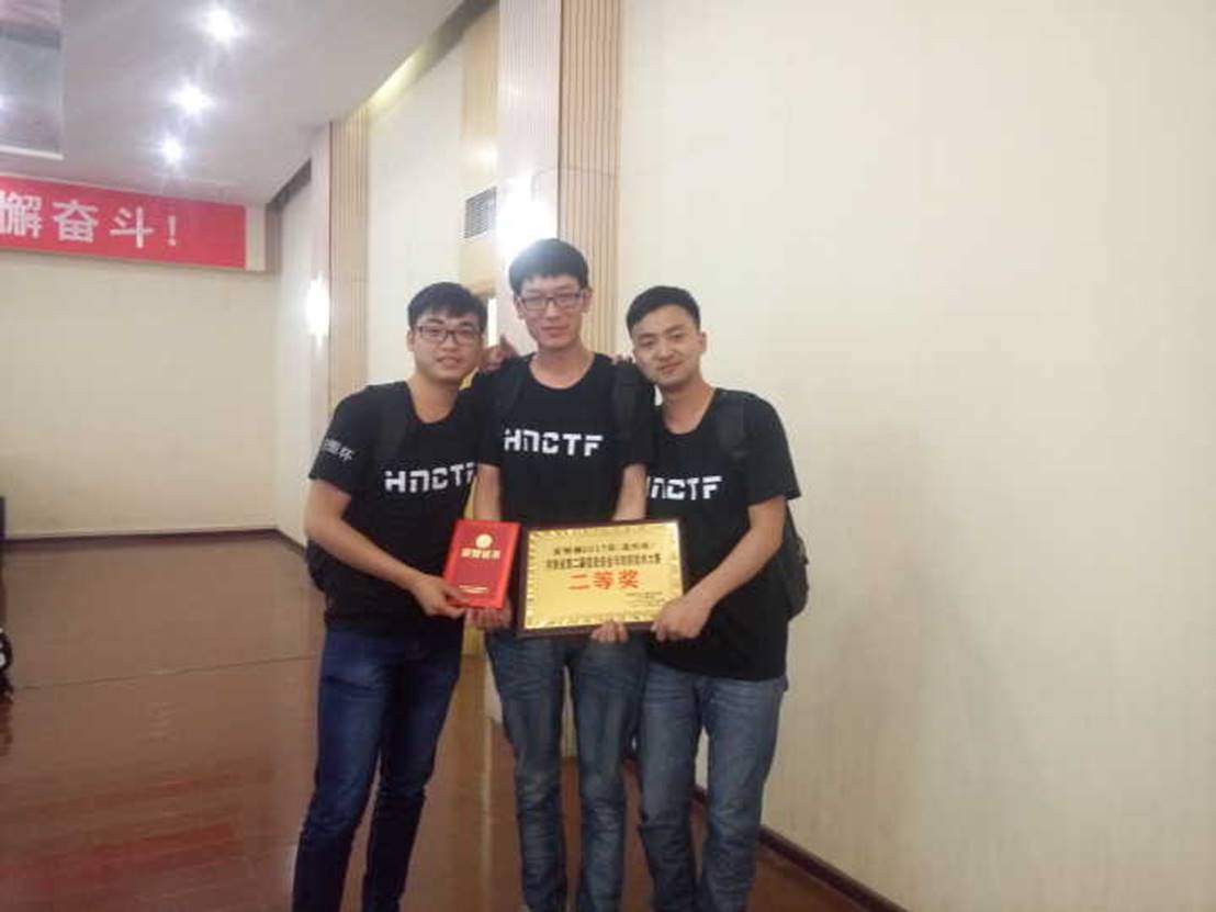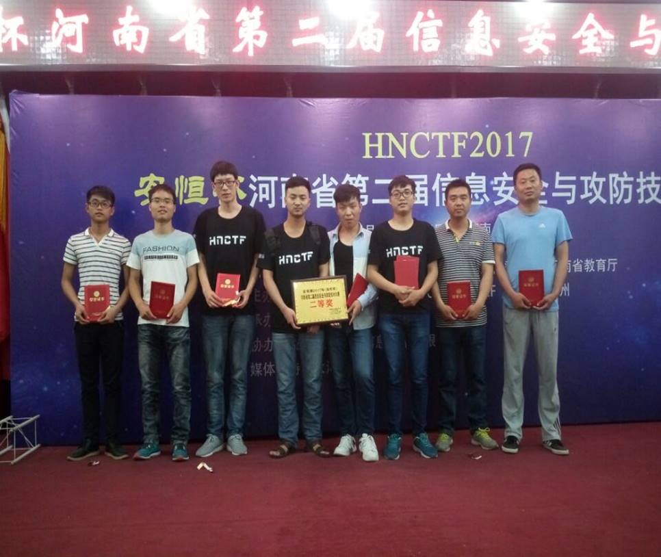 2017年河南省第二届信息安全与攻防大赛由刘骥宇老师和周磊老师领队,由邢燕钞、孙进飞、禄军友学长组成的Fire&Up队取得了二等奖的优异成绩,由贾新轩、贾彦昭、魏晗组成的“火箭朝地”队获得优秀奖。