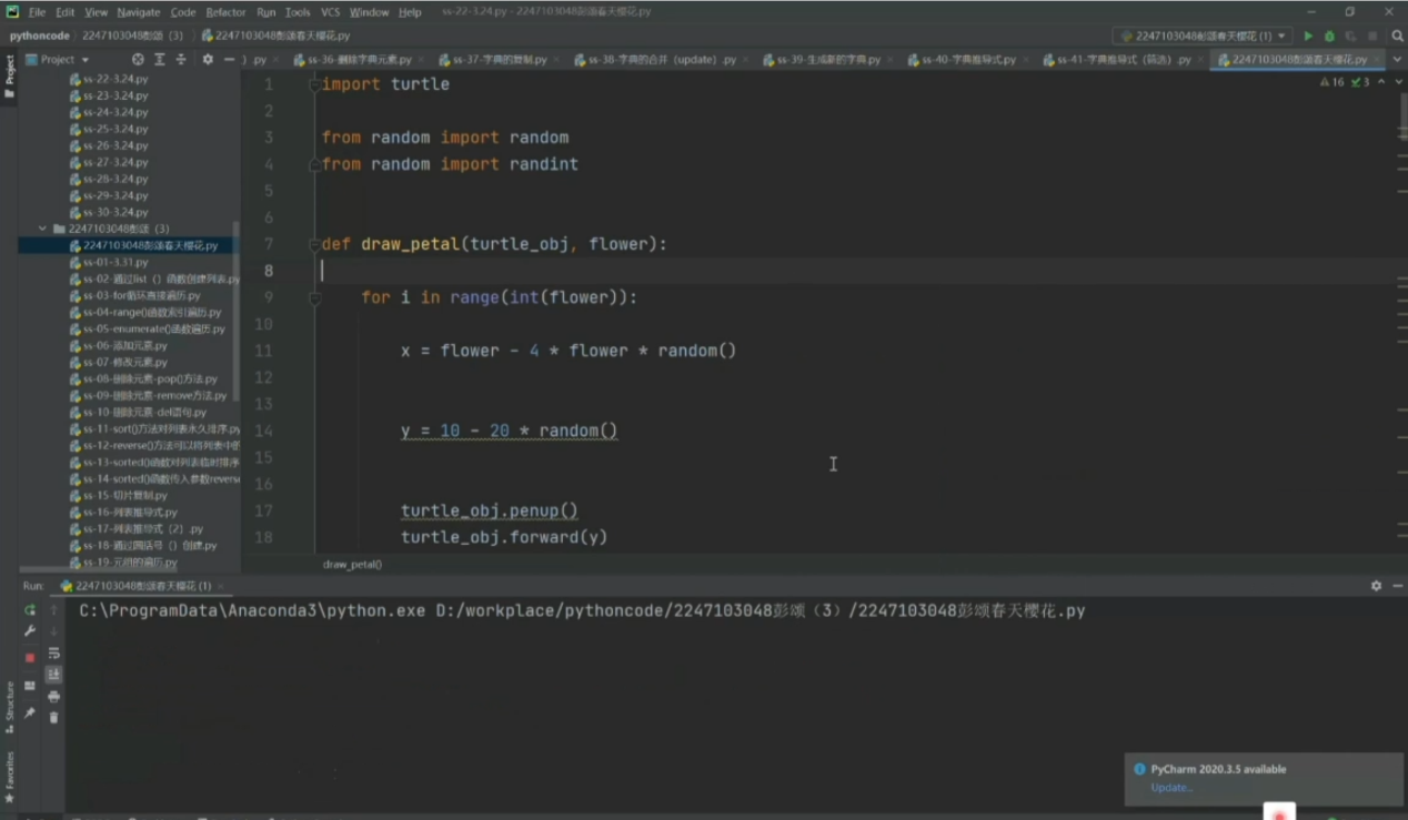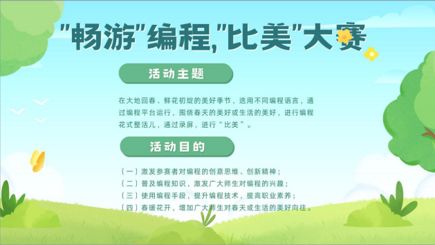 4月17日,畅游大数据社团开展了为期六天的“畅游”编程,“比美”大赛,共吸引了全校180余名同学参与。此次“比美”大赛选用不同编程语言,凭借编程平台运行,围绕春天或生活的美好,进行编程花式整活儿,并通过录屏和剪辑展示不同的美。