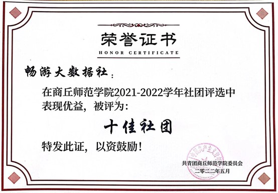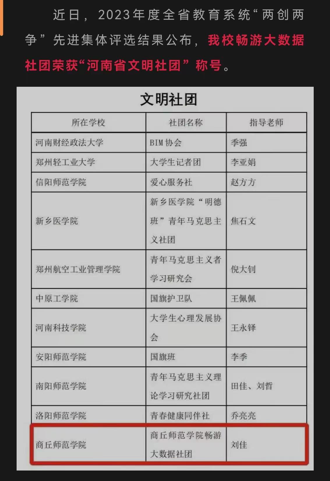 商丘师范学院畅游大数据社团拥有良好的师资力量,畅游大数据社团获评“省级十佳社团”、商丘师范学院“十佳社团”。