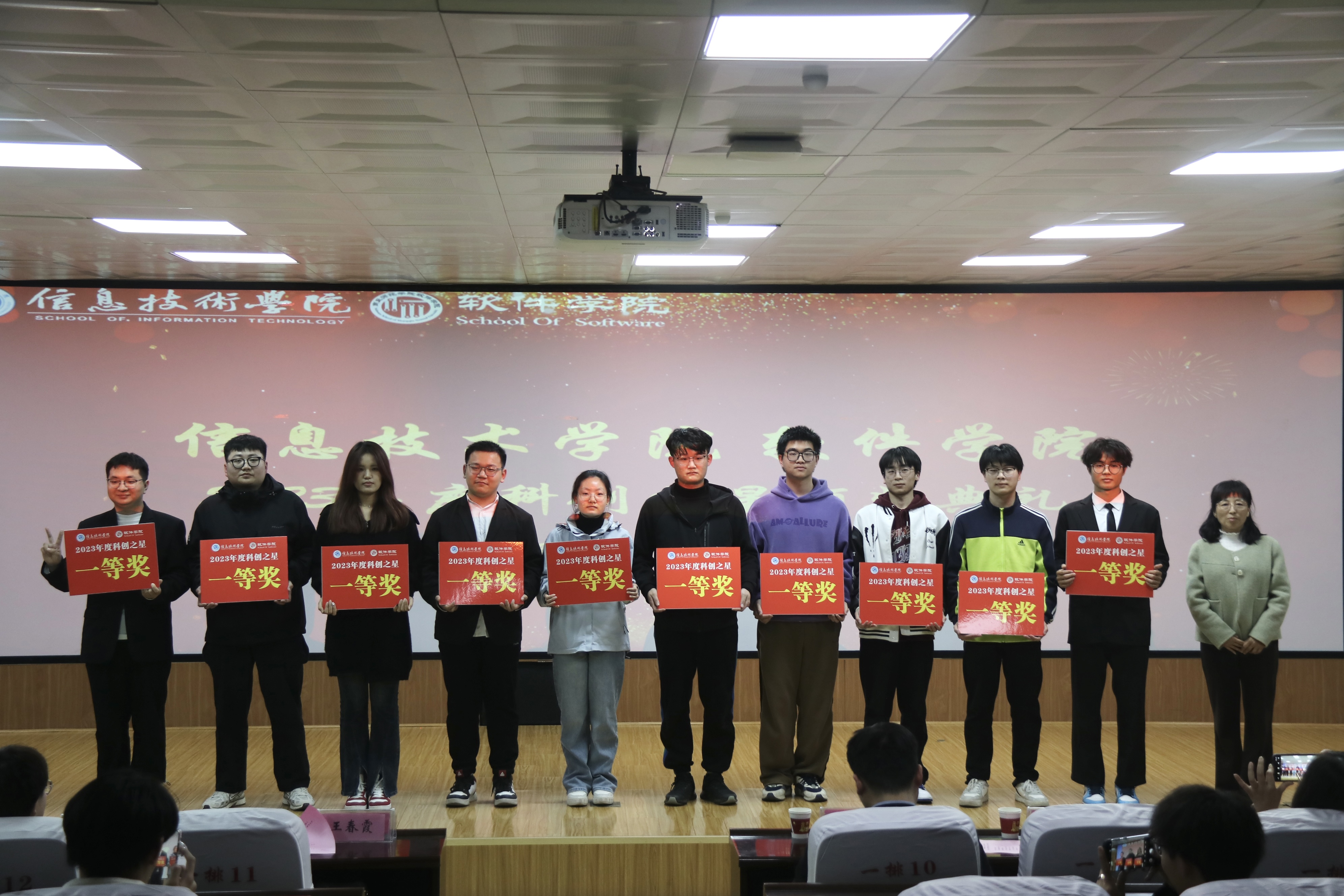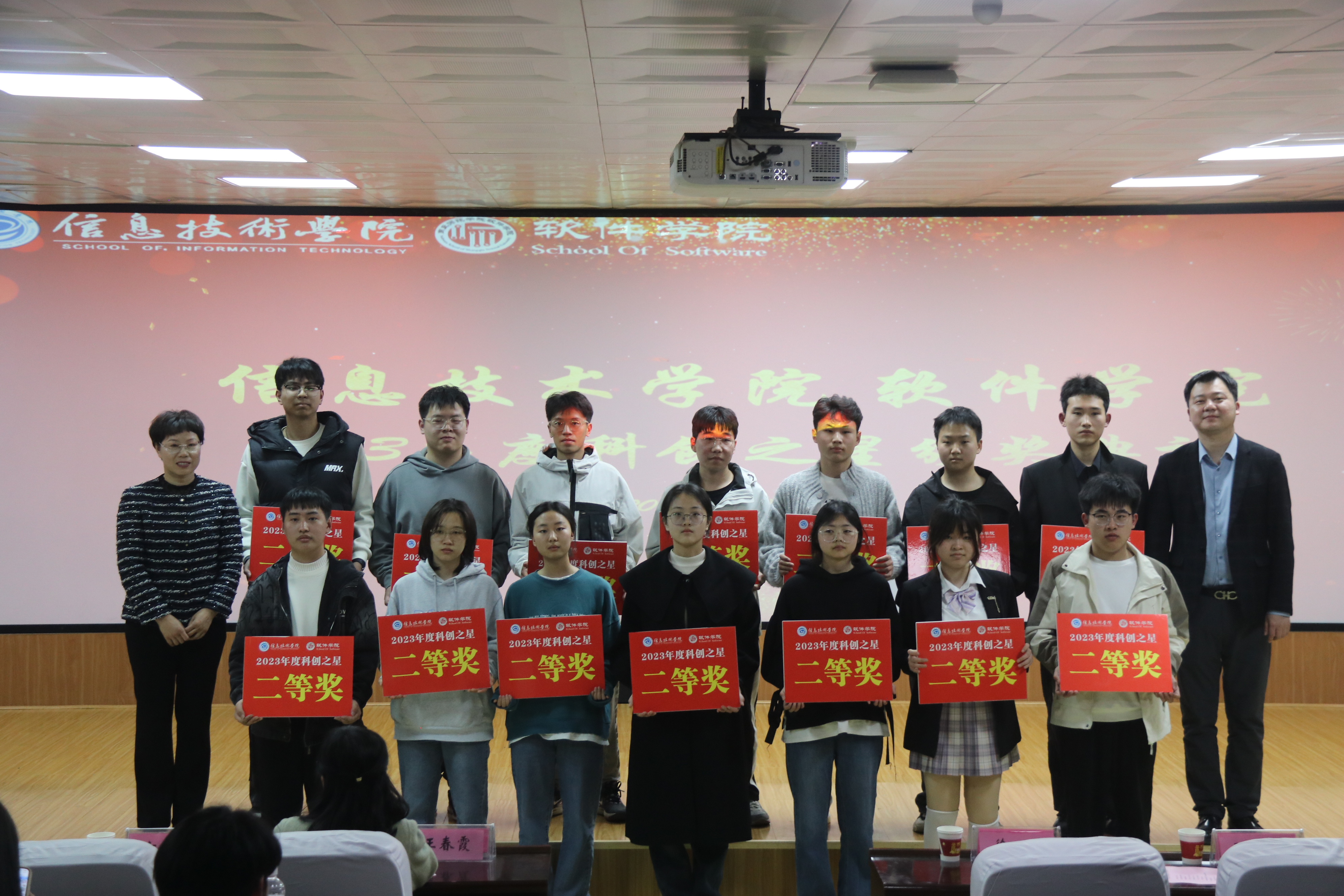 最后,由九九热精品视频副院长刘佳宣读九九热精品视频2023年度科创之星获奖名单,并由各位领导老师依次为获奖的同学颁奖,希望同学们再接再厉,锐意进取,勇攀科技高峰,争做时代新人。