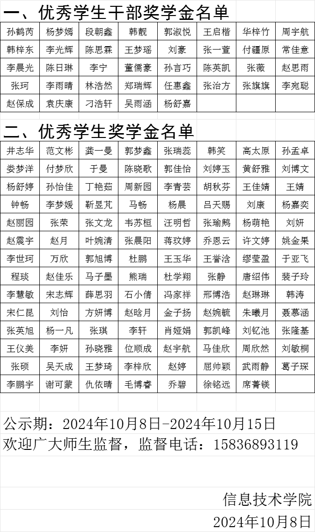 根据省教育厅和学校有关文件精神,经学院“奖学金、助学金评定领导组”评议,确定下列同学为我院2024年优秀学生干部奖学金、优秀学生奖学金获得者。