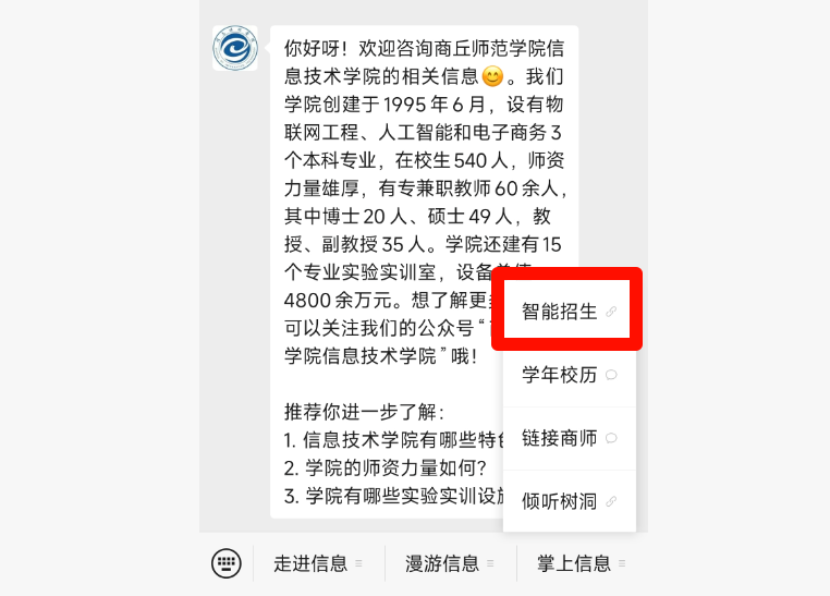 ③微信公众号聊天框点击掌上信息-智能招生
