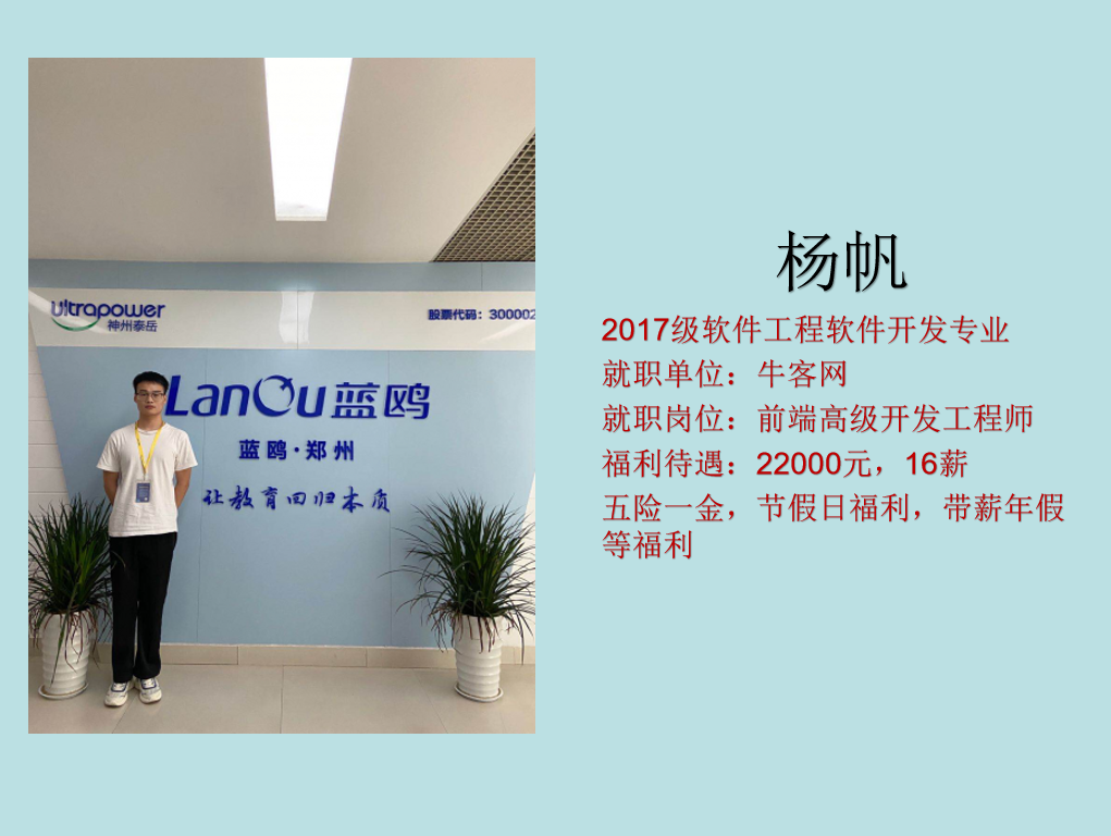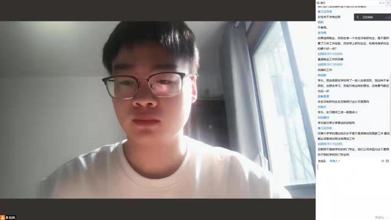 3月15日,九九热精品视频2017级软件工程专业优秀毕业生杨帆与大三,大四年级同学在线上开展了一场关于就业方面的经验交流分享会。