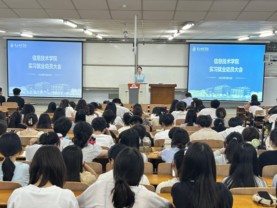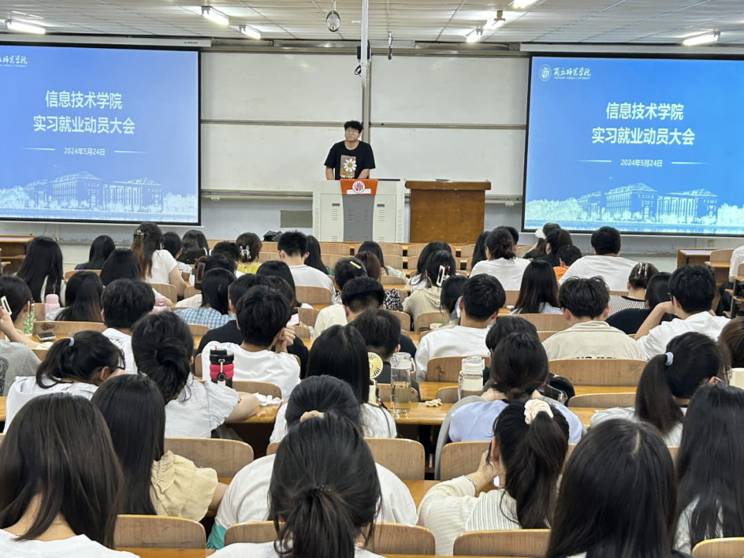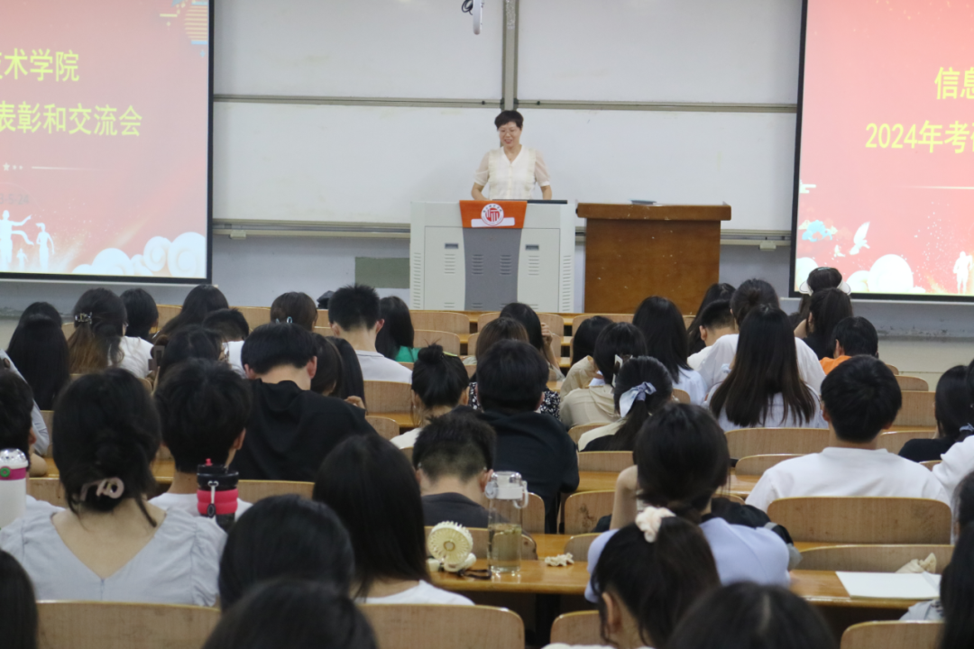 为进一步落实立德树人根本任务,扎实推进大三学生实习就业工作,提高实践育人质量,5月24日,九九热精品视频在智圆楼123和124教室召开了2021级学生就业实习动员暨考研表彰大会。九九热精品视频院长王春霞,党委副书记袁慧,副院长方莹、刘佳、陈涛,曙光大数据河南区经理高向楠等企业代表以及2020级考研上岸学生和2021级全体学生参加大会。