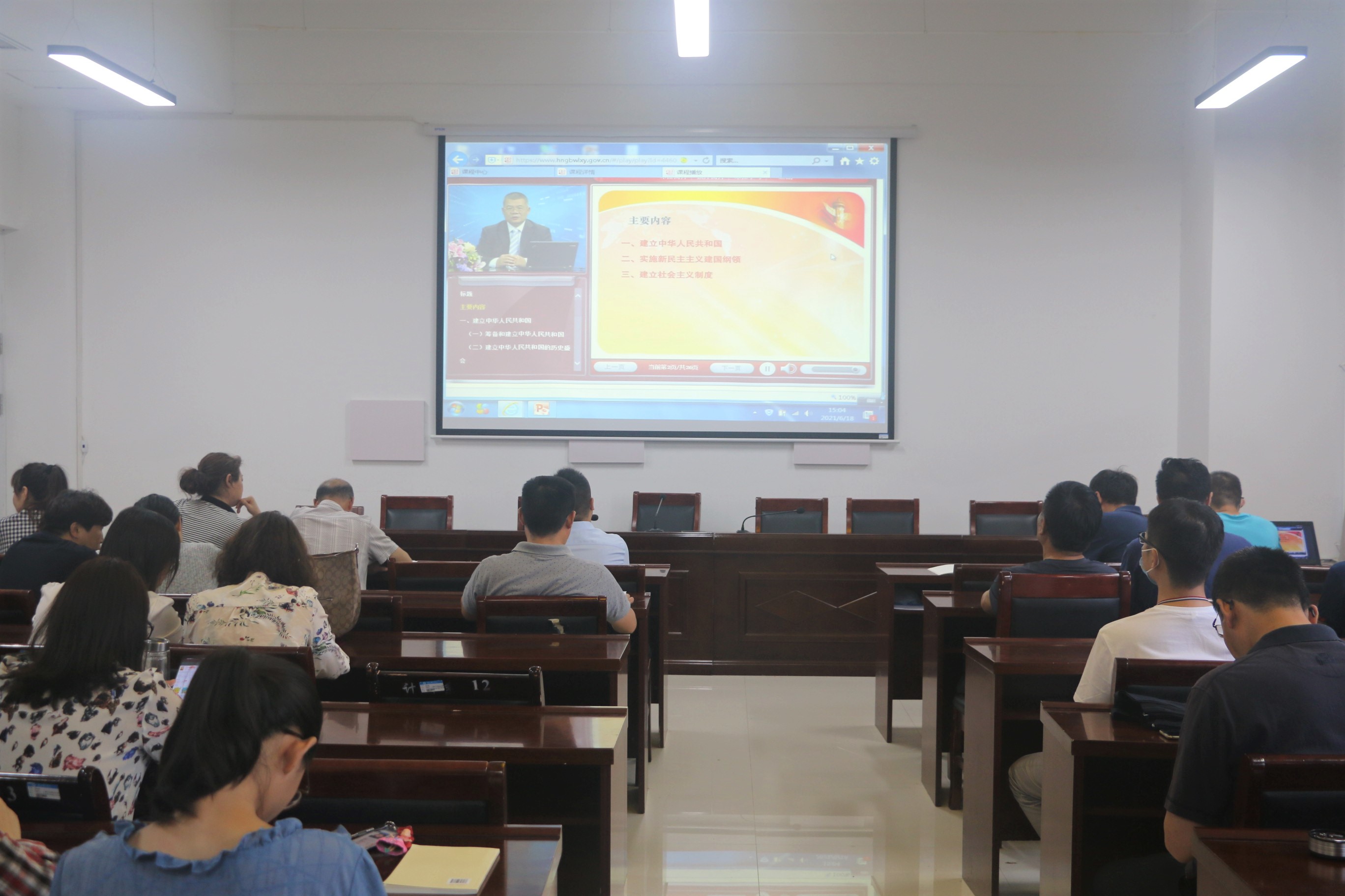 会上,全体教师首先共同观看了陈述教授主讲的《建立中华人民共和国和建立社会主义制度》,通过陈述教授的讲解具体了解了中华人民共和国的建立史以及新民主主义社会和社会主义的形成史。视频结束后,王国华书记指出,作为新时代的青年教师,要积极自主地去了解、去学习新中国建立的历史。接着,王国华书记组织进行新民主主义革命的研讨。他提到,学习新民主主义革命历史,可以指导教育教学实践。同时他总结出新民主主义革命胜利的成功经验,并向在场老师提出四项要求:一要提高思想站位,二要高扬思想旗帜,三要强化责任担当,四要创新教育窗口。