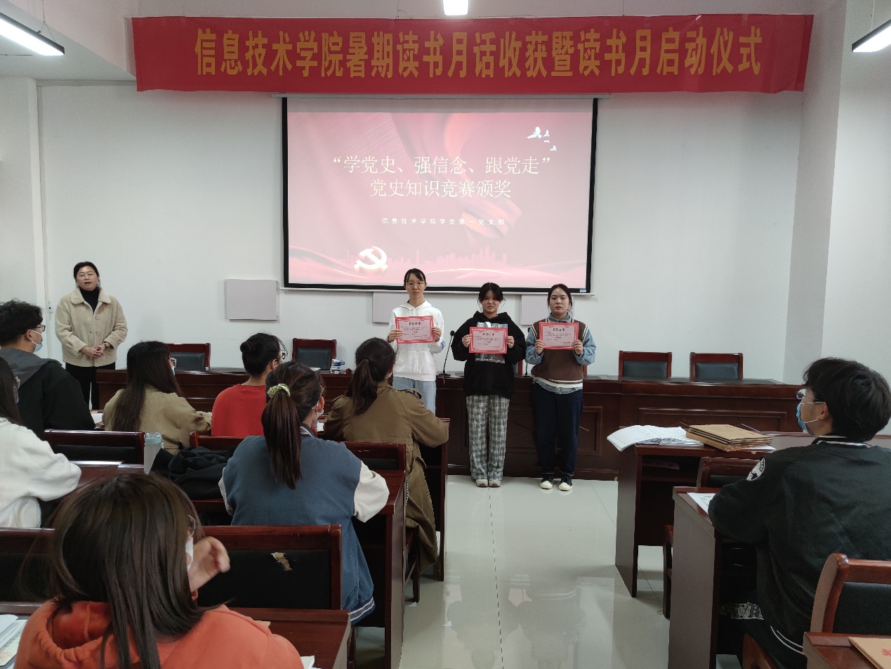 紧接着,进行了“学党史、强信念、跟党走”党史知识竞赛颁奖活动。戴老师担任颁奖人,获奖者们依次上前领奖。随后戴老师发表讲话,她提出要以赛促学,鼓励学生党员要进一步学习党史,了解党的光辉历程。