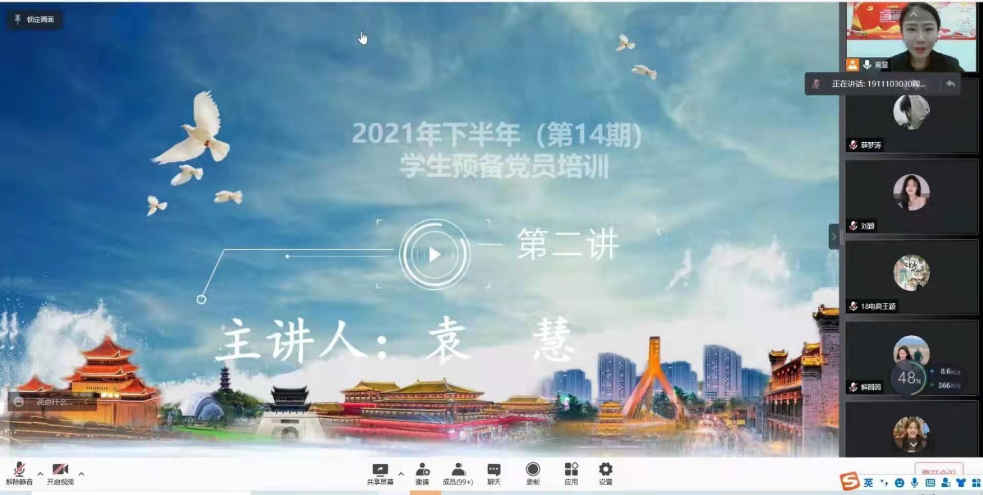 为深入开展党史学习教育,带领学生更好地学习党的光辉历程,增强同学们肩负时代重任的责任感。2021年12月5日,九九热精品视频党委副书记袁慧为2021年下半年第十四期预备党员开展线上党课培训。