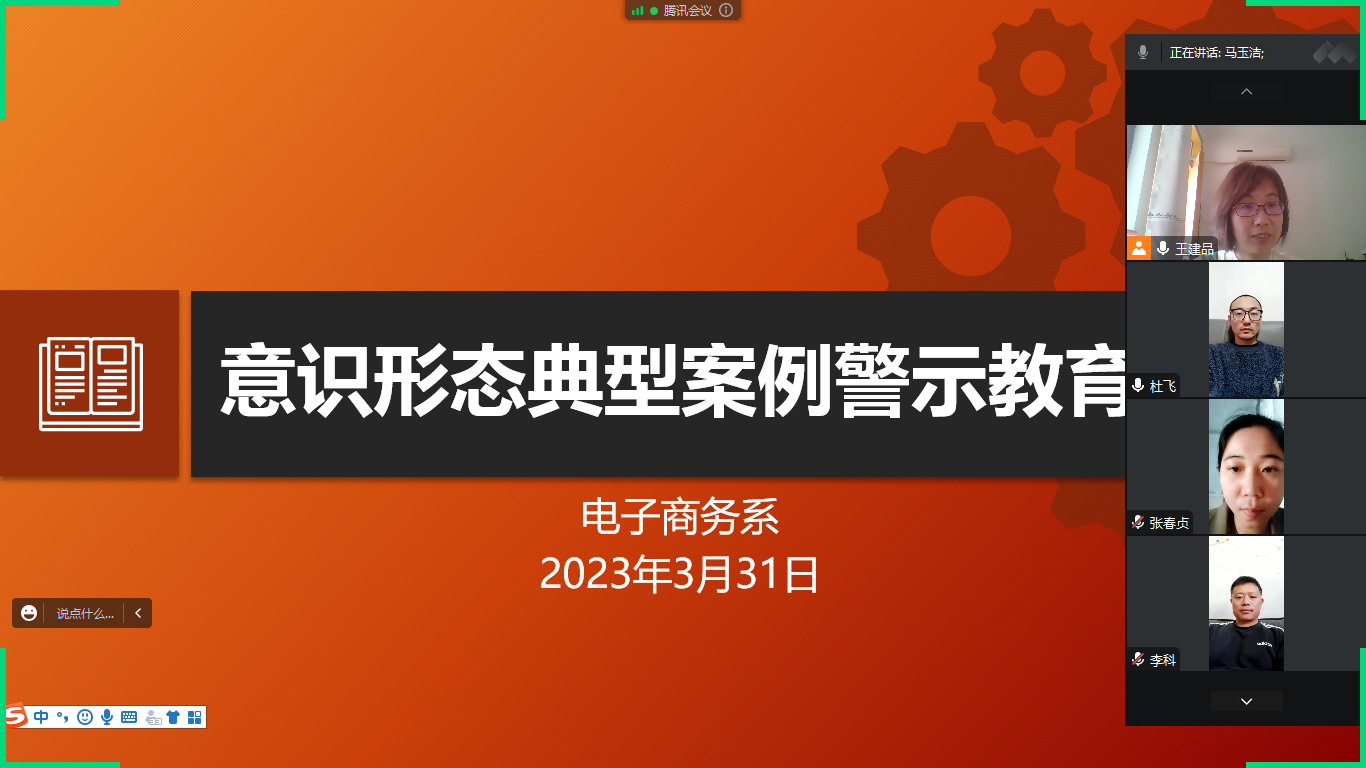 为进一步增强教师教书育人、为人师表的自觉性,3月31日下午,电子商务系全体教师开展了“意识形态典型案例警示教育”教研活动。本次活动采用腾讯会议在线开展,由系主任王建品老师主持。