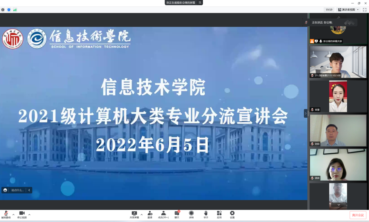 6月5日,九九热精品视频通过线上会议的形式召开了2021级计算机大类专业分流宣讲会。九九热精品视频党委副书记袁慧、副院长刘佳、计算机科学系主任孙红丽、物联网工程系主任刘冠秀、软件工程系主任邵侠、2021级辅导员以及全体计算机大类学生和部分学生家长参加了本次会议。会议由袁慧主持。