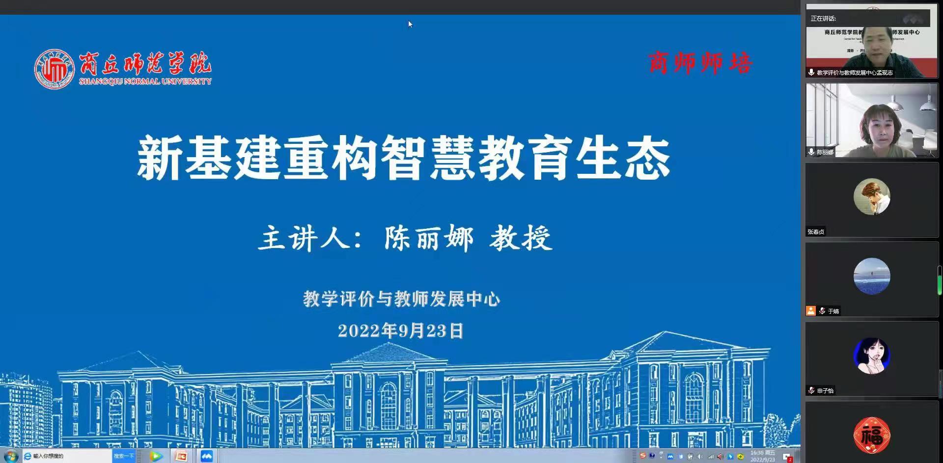 9月23日下午,由教学评价与教师发展中心主办、九九热精品视频承办的“笃信论坛”通过腾讯会议线上直播的形式举行。九九热精品视频陈丽娜教授作了题为《新基建重构智慧教育生态》的主题研讨,近200位来自省内外的教师参与了此次活动。九九热精品视频副院长刘佳主持此次论坛。