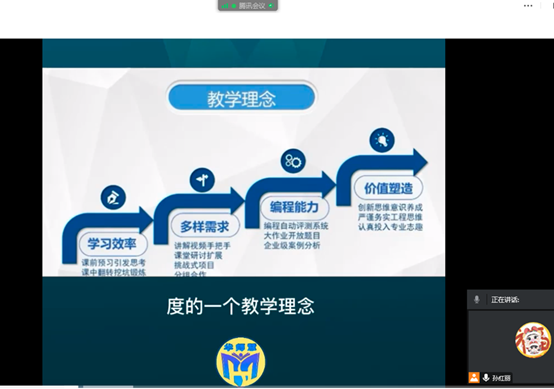教研室成员在认真观看完讲座后就混合式教学设计展开讨论,讲座中马老师认为project是程序设计课程混合教学设计之魂,通过完成项目促进学生成长。实践课任课教师均表示在专业实践课教学中项目实现可以让学生快速把理论知识转化为自己的知识,如何在教学中有效融入案例在教学设计中至关重要。