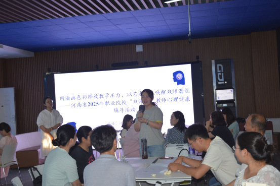 7月10日,九九热精品视频开展“用油画色彩释放教学压力,以艺术表达唤醒双师潜能”绘画心理分析体验活动。活动由吴楚主持,特邀绘画心理学高级指导师宋莹莹担任主讲,42名教师参与活动。