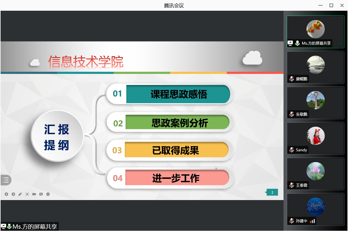 最后方莹老师给大家展示了一节课程思政设计的主要内容,大家就此展开研讨,课程思政可以积极引导当代学生树立正确的国家观、民族观、历史观、文化观,从而为社会培养更多德智体美劳全面发展的人才,为中国特色社会主义事业培养合格的建设者和可靠的接班人,教学设计中一定要重视思政内容的体现。