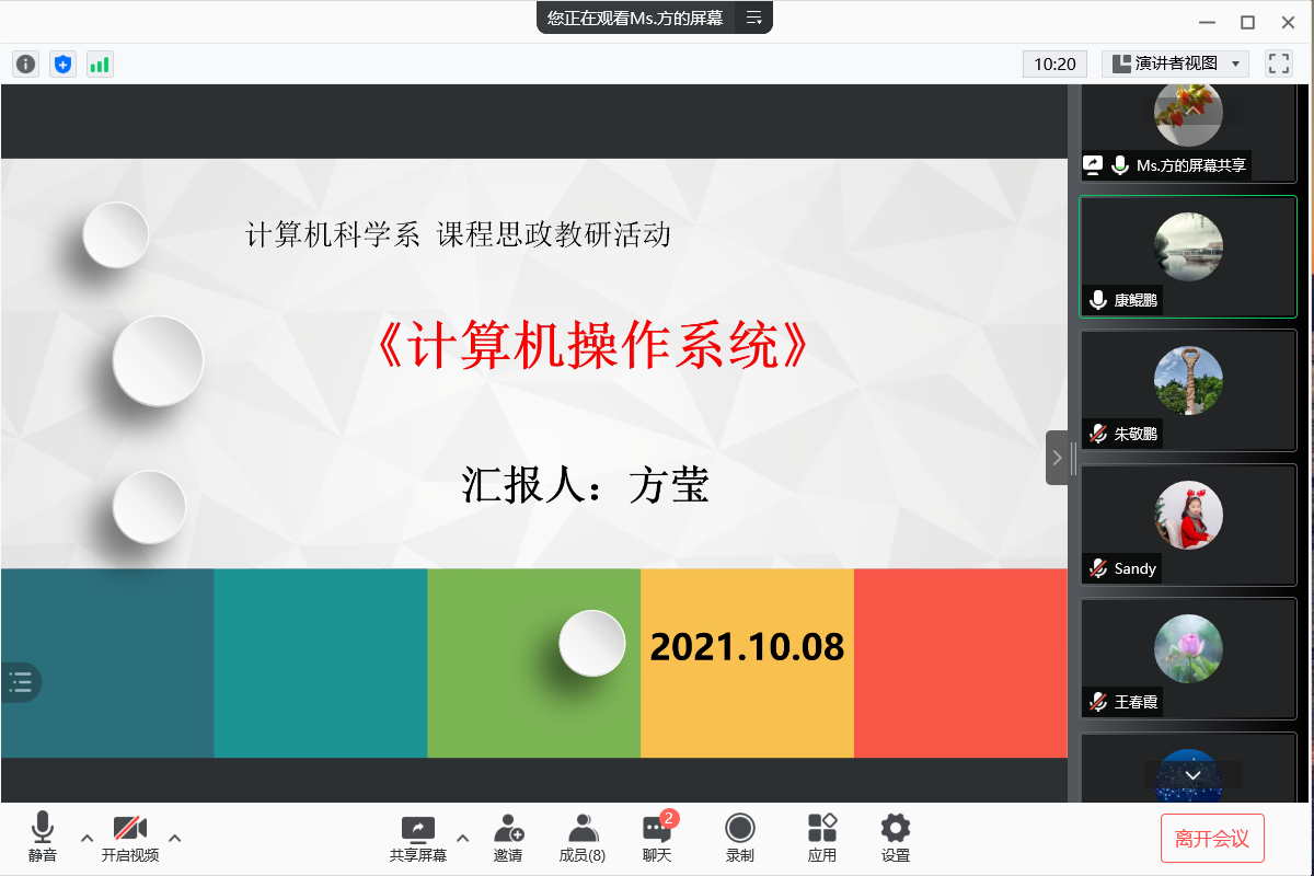 10月8日晚上7点,计算机科学系采用腾讯会议召开了《操作系统》课程思政教学设计主题教研活动。本次活动中,课程思政样板课主持人方莹老师分享了自己在探索如何将思政元素有机融入到课程教学的做法及体会,最后教研室成员就各自课程探讨了如何选择思政元素和知识点相结合,科学融入实现立德树人这一目标。